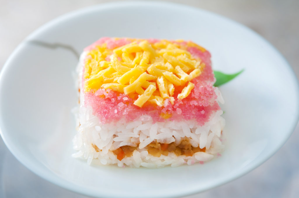具材はゴボウ、ニンジン、レンコン、タケノコなど根菜の食感を残しながら味よく仕上げ、錦糸卵と桜色のおぼろをトッピング。